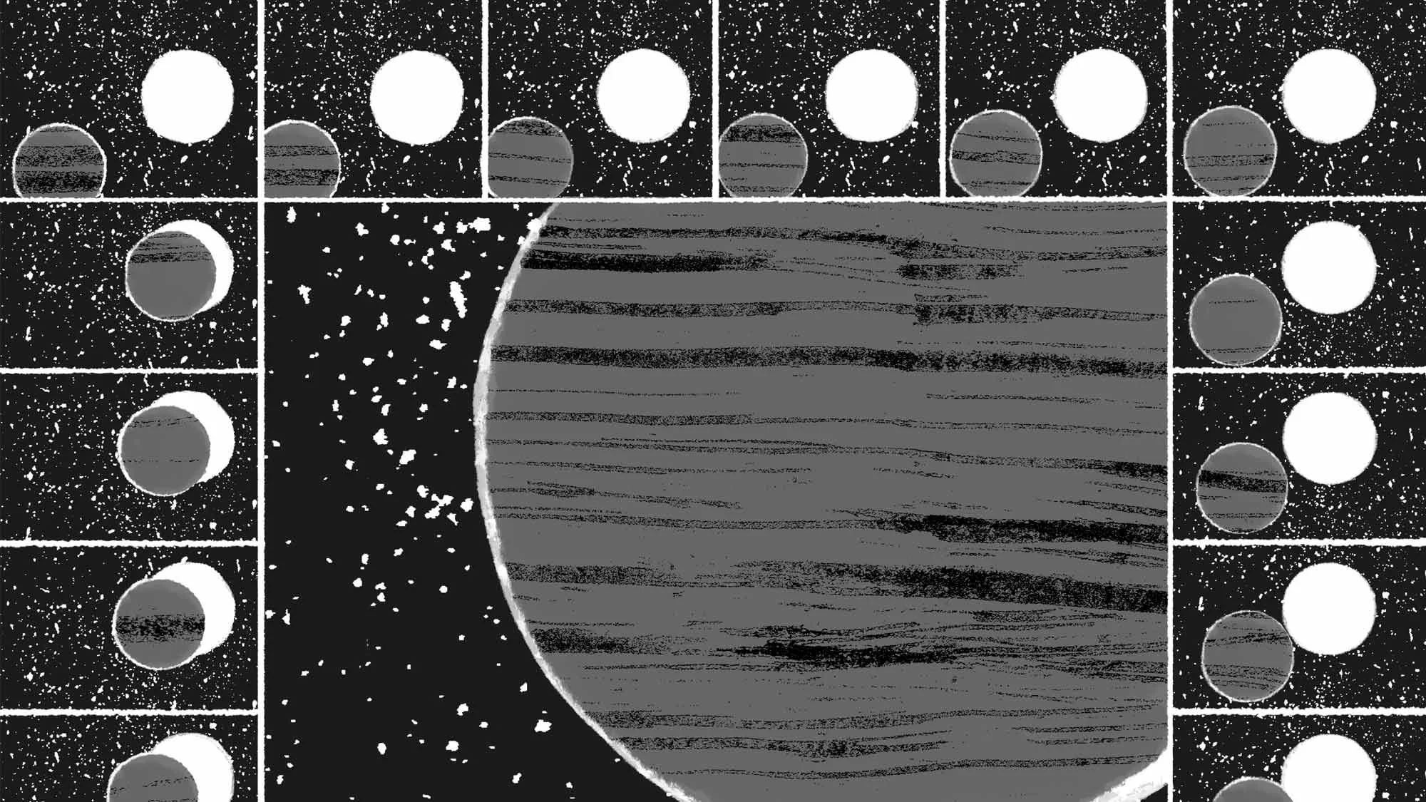 Pour le n°7 , j’ai proposé le thème Éclipse en illustrant le mouvement de deux astres à la limite de leur superposition complète. J’ai aussi invité les membres d’Hyper Triste, composés de Lou Ollivier, Bastien-Christophe, Robin Penna et Kane Mooney à réaliser une narration collective et collaborative pour le dépliant A3.